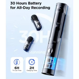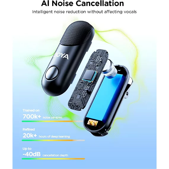 از ویژگیهای بارز این میکروفون میتوان به فناوری حذف نویز هوش مصنوعی (AI Noise Reduction) اشاره کرد که تا 40 دسیبل نویز محیطی را به صورت لحظهای حذف میکند و صدای بسیار شفاف و واضحی ارائه میدهد. باتری آن 6 ساعت دوام دارد که با استفاده از کیس شارژ، این زمان تا 30 ساعت قابل افزایش است.