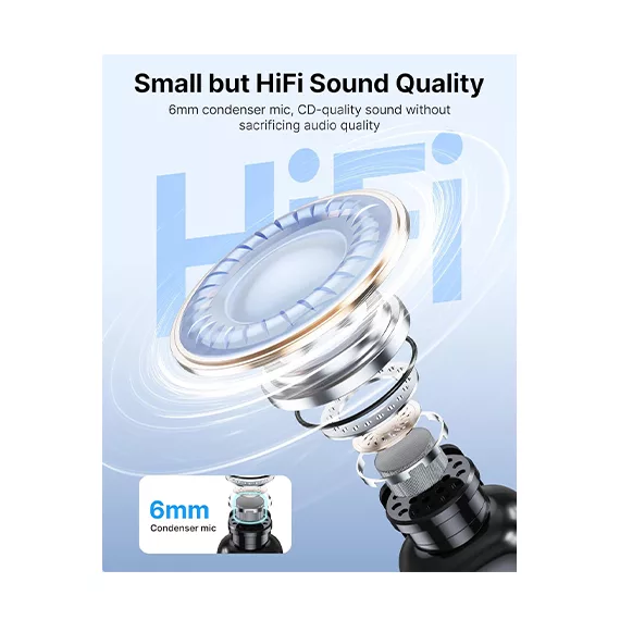 حذف نویز AI در ۳ سطح، انتقال بیسیم تا 328 فوت، وزن 5 گرم، باتری 6 ساعت، تغییر صدای AI، کیفیت صدای CD، میکروفون یقهای و دستی