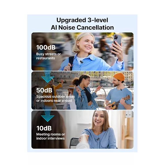 با کیفیت صدای 16 بیت و 48 کیلوهرتز، صداها بهصورت واضح و طبیعی ضبط میشوند که برای پادکستها، مصاحبهها، ویدیوهای کوتاه و جلسات آنلاین ایدهآل است. فناوری حذف نویز AI در این محصول، با سه سطح تنظیم (ضعیف، متوسط، قوی) صدای پسزمینه مزاحم مانند ترافیک یا صدای جمعیت را حذف میکند تا صدای شما شفاف و بدون اختلال ضبط شود.